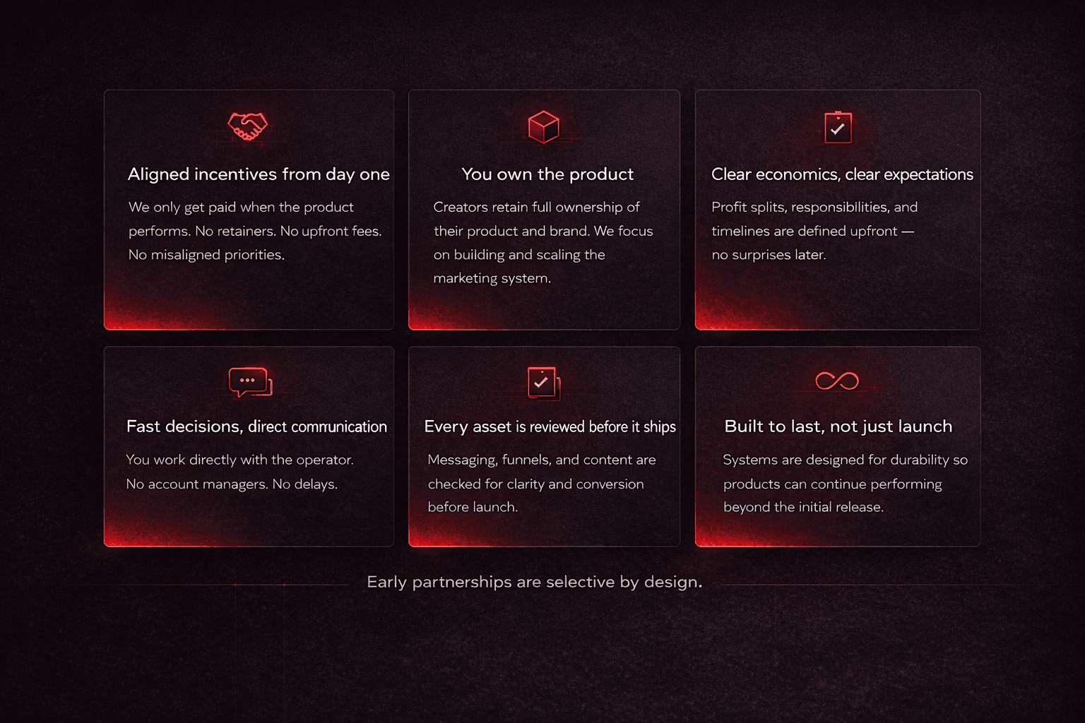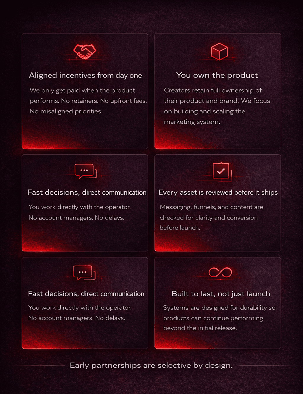 Creators retain full ownership of their product and brand at all times. If a partnership evolves or concludes, the product and underlying systems remain in place so the creator can continue operating independently. Because VP Marketing Ops is involved in building and scaling the marketing infrastructure, continuity and expectations are established upfront to ensure a clean, professional transition if needed. The goal is long-term alignment, but the structure is designed to be fair, transparent, and durable regardless of future decisions.